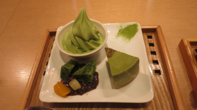 抹茶のソフトクリーム、わらび餅、チーズケーキの3種が贅沢に盛られており、どれも濃厚で甘さ控えめ。