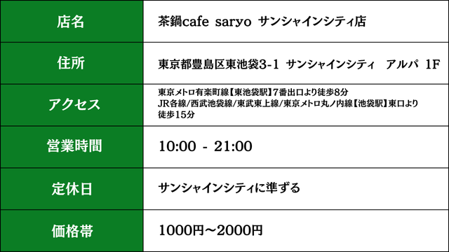 サンシャインシティアルパ3階にある「茶鍋カフェ kagurazaka saryo」は、和の雰囲気とスタイリッシュなインテリアが融合した抹茶カフェ。席間が広く落ち着いて過ごせる空間です。