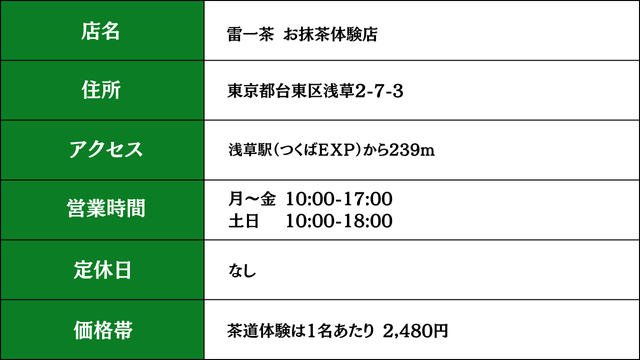 2. 雷一茶 お抹茶体験店(浅草)|石臼体験が楽しい!スイーツ付きのカジュアル体験