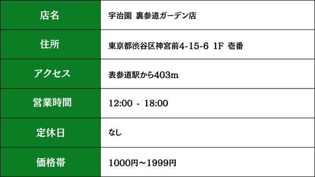 宇治園 裏参道ガーデン店|宇治抹茶の伝統を受け継ぐテイクアウト専門店