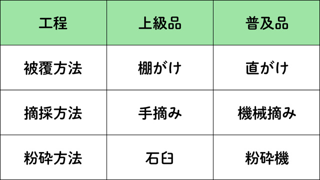 抹茶の品質は、以下の工程で大きく分かれます。