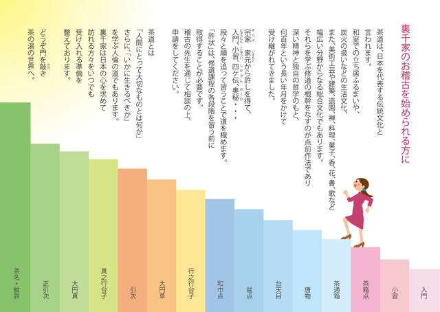 裏千家では、茶道の学習進度に応じた段階的な認定制度である「許状(きょじょう)」制度を設けています。入門から始まり、小習、茶箱点、茶通箱、唐物、台天目など、一定のカリキュラムを順に習得することで、技術や精神性の深まりを図ることができます。