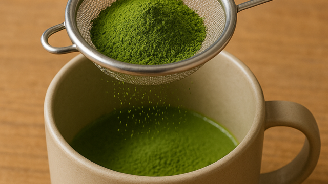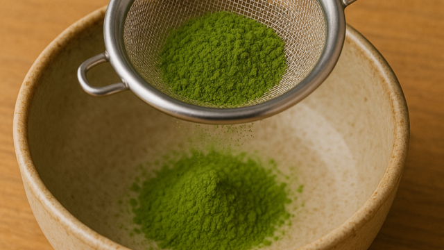 抹茶は粒子の大きさにムラがあり、静電気や湿気で塊になりやすいため、そのまま使うとどうしてもダマができます。茶こしでふるうことで均一な粉になり、溶けやすくなるのです。