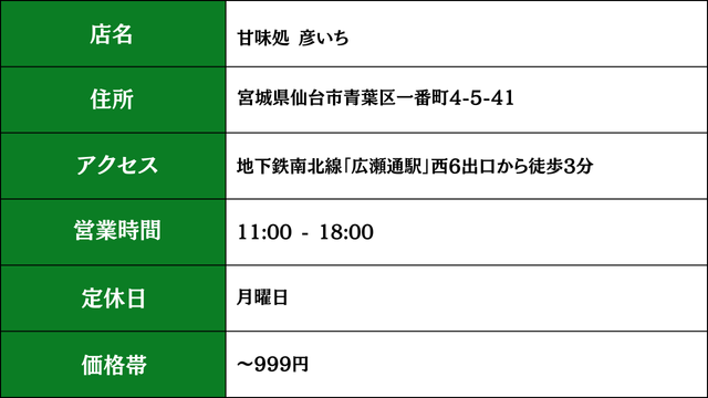 - 彦いち(一番町)…抹茶パフェやあんみつの甘味処。 食べログYahoo!マップ