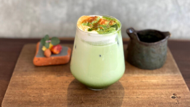 和束・牧之原の茶農家から届く茶葉を使用した抹茶ラテが至極の一杯。