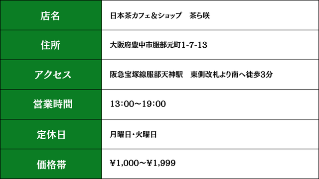 1. 日本茶カフェ&ショップ 茶ら咲(豊中市・服部天神)