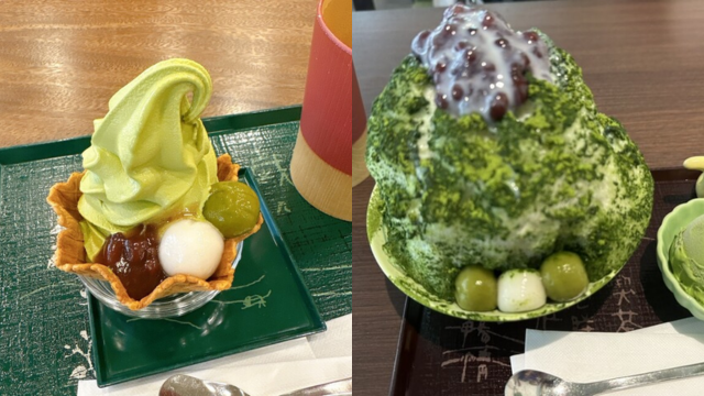 抹茶パフェや抹茶かき氷など、宇治抹茶を使ったスイーツが人気。パフェは抹茶アイス、あんこ、ゼリーなどが層になっていて、見た目も華やかで食べ応えがあります。お買い物の合間に、ちょっと贅沢な抹茶時間を楽しめます。