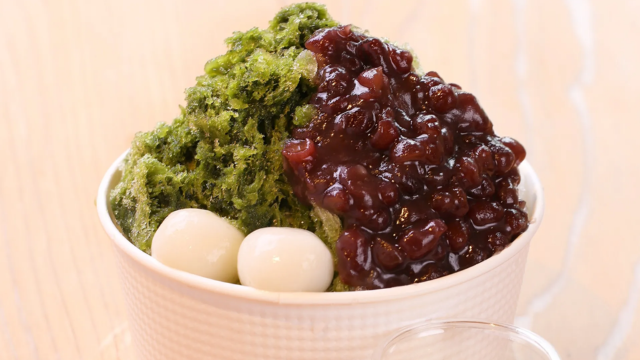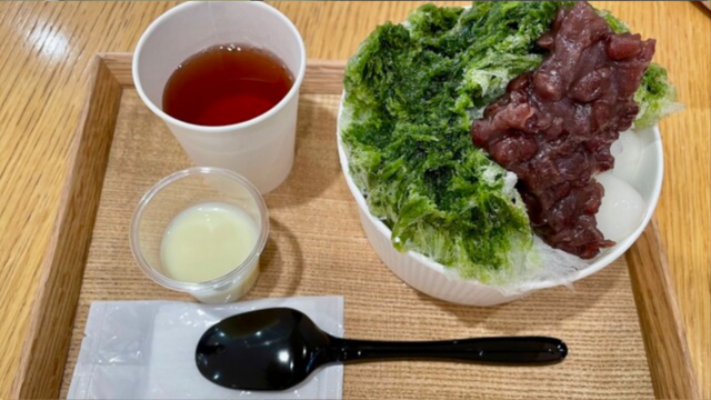 特に人気なのが「抹茶小豆かき氷」。濃厚な抹茶蜜に大納言小豆と白玉2つがのっていて、練乳をかければ甘さと香りの三重奏を楽しめます。歩き疲れたときや、観劇前後に気軽に立ち寄れるのが嬉しいですね。