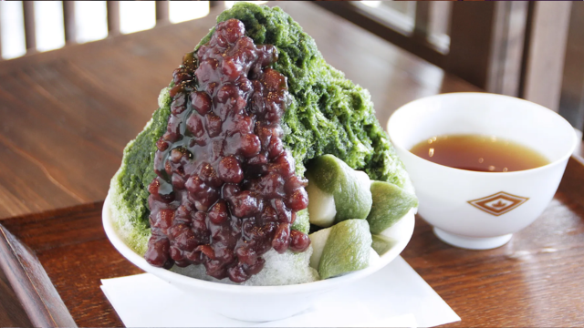 夏季限定の人気メニュー「石餅かき氷(抹茶)」は、しっかりした抹茶蜜に石餅や小豆がぎっしり。散策の途中に、涼と甘味を味わえる贅沢な一杯です。