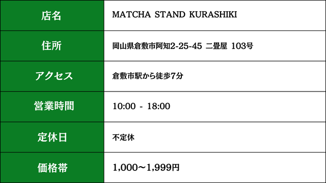 ① MATCHA STAND KURASHIKI 【倉敷市・美観地区】