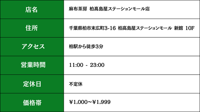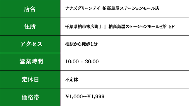 - 柏駅近く・百貨店モール内には nana’s green tea や 麻布茶房 があり、アクセスの良さとメニューの安定感が強みです。ショッピング中心の予定がある日には重宝します。