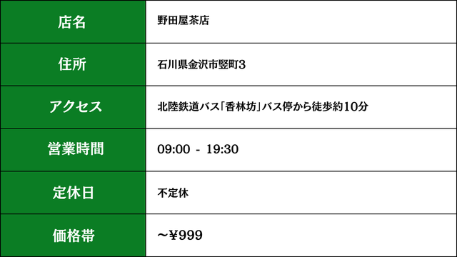 1859年創業の老舗で、竪町や香林坊の近くにあります。抹茶ソフトクリーム、加賀棒茶ソフト、抹茶パフェなど、和スイーツのラインナップが豊かで、「抹茶をしっかり味わいたい」気分に応える店です。