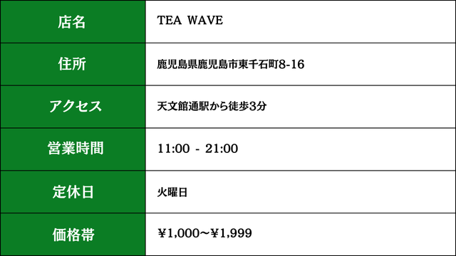 特徴:天文館の繁華街にあるカフェで、地元茶葉を使った抹茶ドリンク・抹茶スイーツを展開しています。Instagramアカウントで抹茶系ドリンクやスイーツの写真を見かけます。