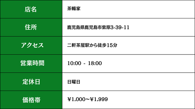 - 駅近くで手軽に味わいたいなら、鹿児島駅近の 茶舗ひなが が便利。