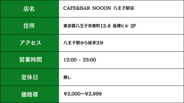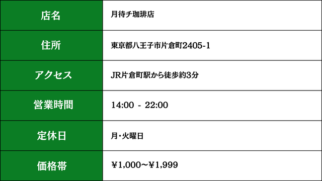 特徴:八王子駅近くにあるカフェ兼バー。「抹茶パフェ」がイチオシメニューのひとつとして紹介されており、スイーツ系として抹茶要素を楽しめるお店です。夜カフェとしても使える雰囲気。