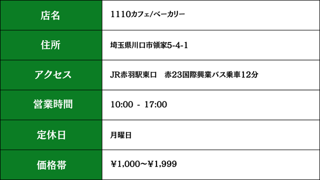 川口市周辺には、プラントベースな環境重視型カフェの 1110 CAFE / BAKERY、老舗茶屋系の信頼感ある 香楽園 本店、そして商業施設内で使いやすい 茶寮 伊藤園 アリオ川口店 のように、性格の異なる抹茶・和甘味のお店が揃っています。