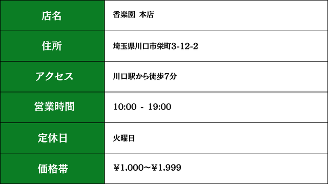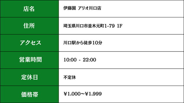 老舗お茶屋さんで、樹モール(川口銀座商店街)にあります。抹茶アイスなど濃厚な抹茶系商品を扱っているとの紹介があり、お茶屋としての信頼感もあります。