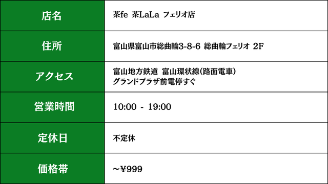 ①茶’fe 茶LaLa 総曲輪フェリオ店(富山市 総曲輪)