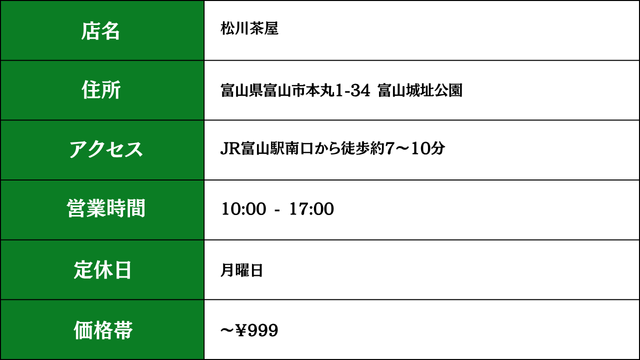 富山城を模した“抹茶パフェ(800円)”が名物という情報が口コミにあります。小豆・白玉など和素材とともに抹茶味を楽しめるデザートです。