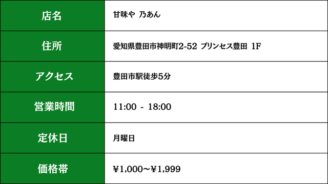 豊田市には、駅近で気軽に訪れやすい 甘味や 乃あん、和の甘味を現代風にアレンジした抹茶どらやきが味わえる「自然菓工房 あずき庵」、そしてゆったり和茶を味わえる みるる と、タイプの異なる3軒があります。甘さの濃さや雰囲気もそれぞれ違うので、その日の気分やシーンに合わせて使い分けてみてください。