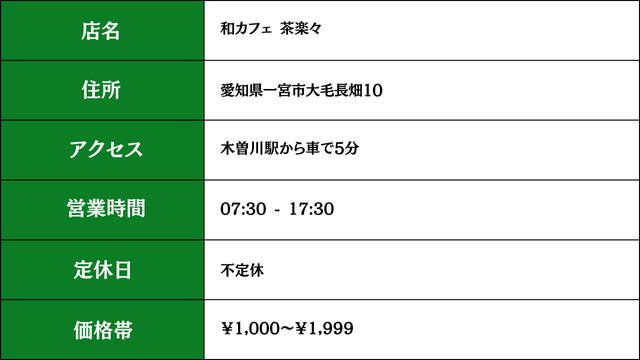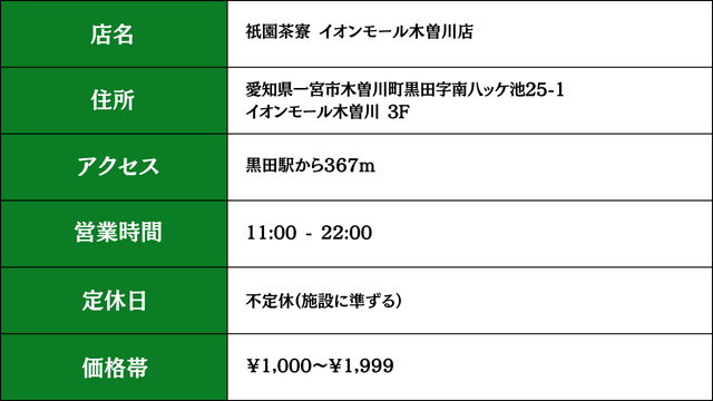 ショッピング施設「イオンモール木曽川」内にある店舗。宇治抹茶を使ったデザートや飲料を提供しており、抹茶のティラミス・抹茶アイスパフェ・抹茶ドリンク がメニューにラインナップされています。モールでの買い物ついでにも立ち寄りやすいのが魅力です。