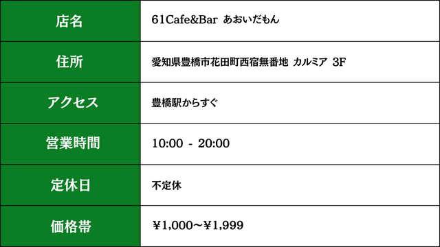 ①61Cafe&Bar あおいだもん(豊橋駅ビル・カルミア3F)