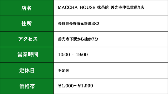 おすすめポイント:観光のメインルート上にあるため、善光寺参詣や街歩き途中の休憩にぴったり。抹茶スイーツの種類が豊富で、テイクアウトも可能です。