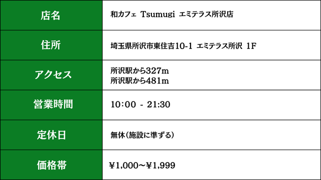 • 和カフェ Tsumugi エミテラス所沢店:大きな窓から光が差し込む開放的な空間。買い物の合間に、香り高い抹茶と和スイーツでほっと一息つけるモダンなカフェ。