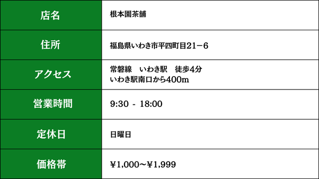 • 根本園茶舗(平・四町目):街なかの日本茶・抹茶専門店。