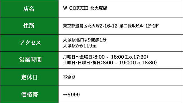 - W COFFEE 北大塚店:濃抹茶ラテと甘味が評判